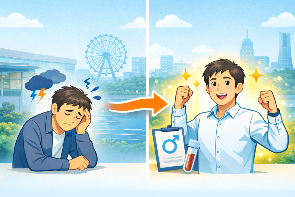 お知らせ ホーム お知らせ 男性更年期外来開始のお知らせ 男性更年期外来開始のお知らせ 2026.01.24 お知らせ 当院では、1月26日より男性更年期外来を開設いたしました。 疲れやすさ、意欲の低下、気分の落ち込み、性機能の変化など、男性ホルモン(テストステロン)の低下に関連する症状に対して、評価と治療をご案内しております。 男性ホルモンの値が気になる方は、検査のみのご相談も可能です。 受診をご希望の方は、診察時にお気軽にお申し出ください。 男性更年期について詳しく知りたい方はこちらご参照ください。