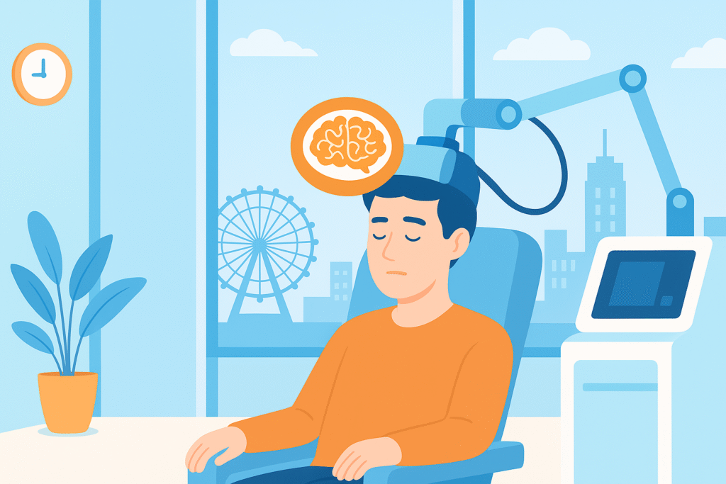 TMS(経頭蓋磁気刺激)治療は、磁気を使って脳の特定の部位を刺激し、神経活動を整える薬を使わない治療法です。